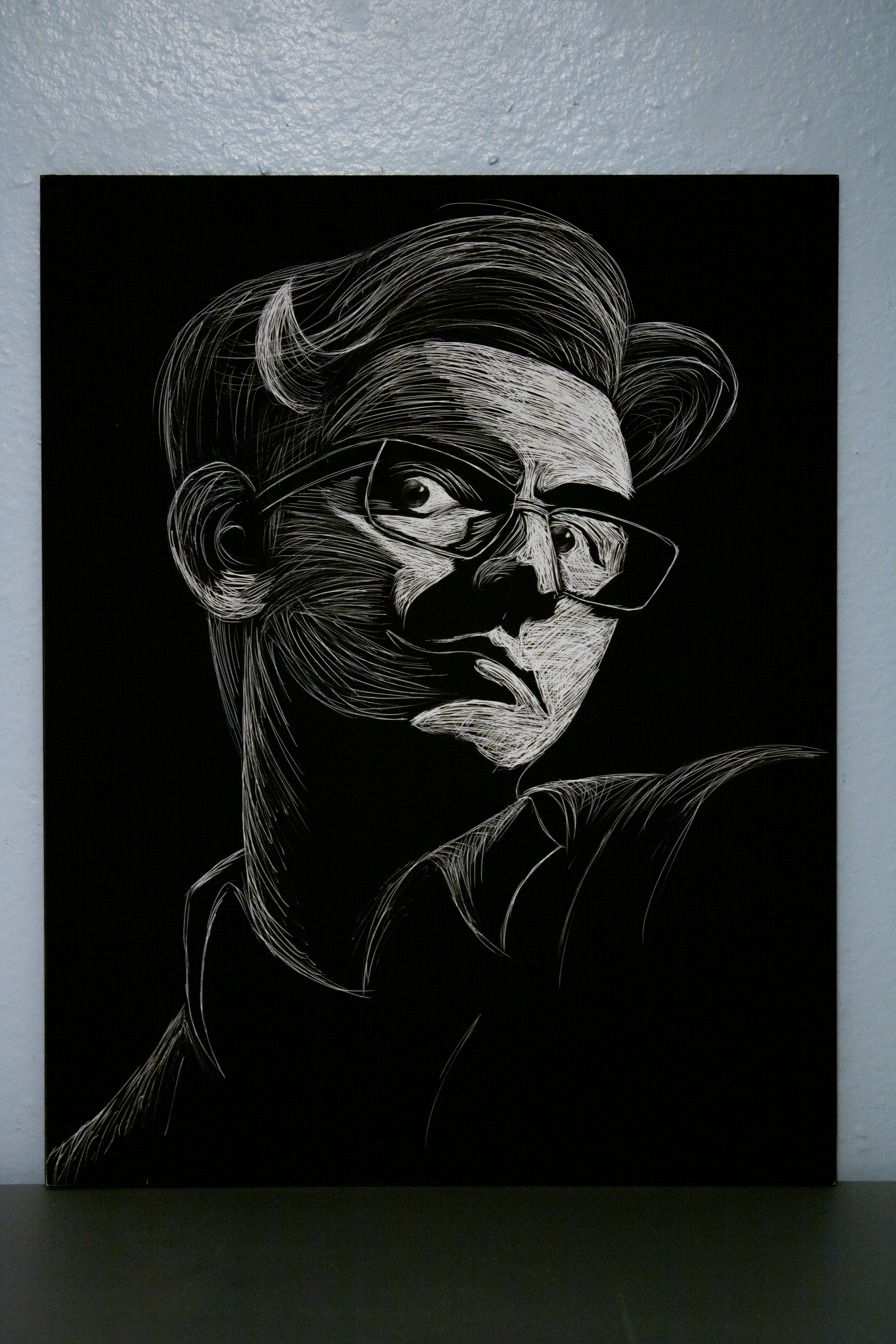 Self portrait in scratchboard. | Reference image.