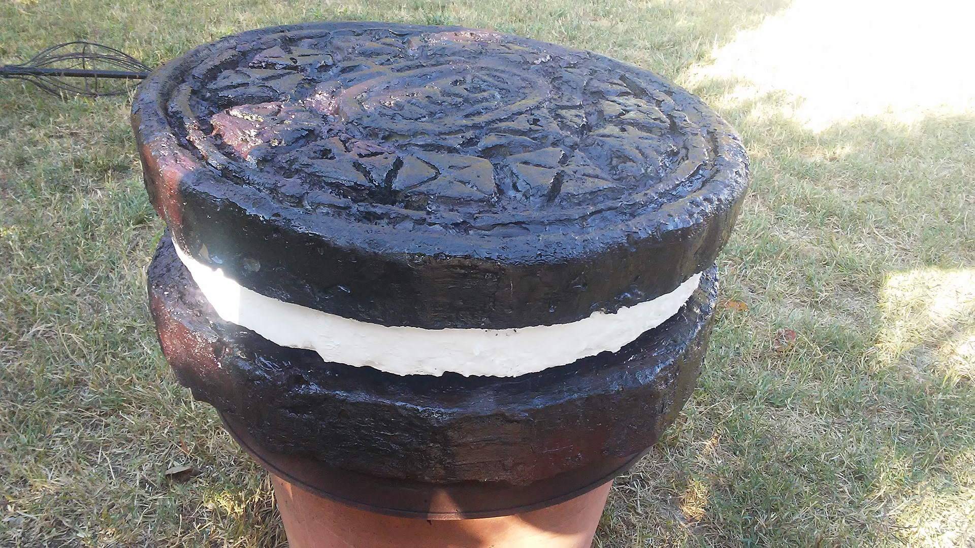 Oversized sculpture of an Oreo cookie.